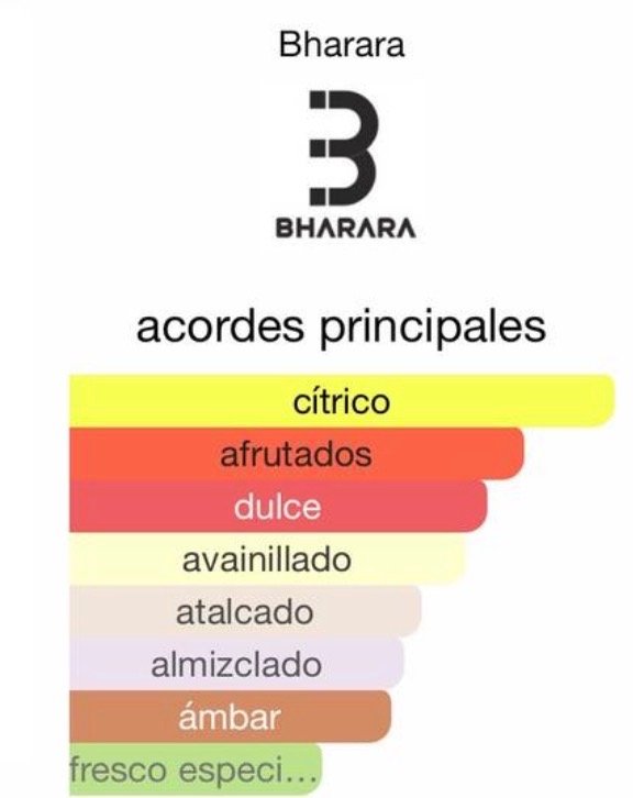 Bharara King es una fragancia cítrica‑afrutada y dulce, con salida de naranja, limón y bergamota, corazón de notas afrutadas y fondo de vainilla, almizcle blanco y ámbar. Su aroma es fresco, juvenil y envolvente, ideal para ocasiones diurnas y climas cálidos.