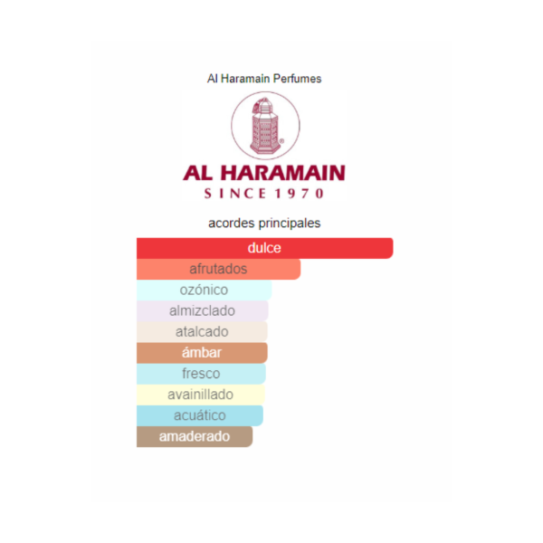 Amber Oud Gold Edition de Al Haramain es una fragancia gourmand‑frutal‑amaderada que combina notas dulces y cálidas con un toque afrutado. Su apertura fresca y vibrante de bergamota y notas verdes da paso a un corazón jugoso de melón, piña, ámbar y un acorde gourmand, mientras que su base envolvente de vainilla, almizcle y notas amaderadas proporciona una estela elegante y sofisticada