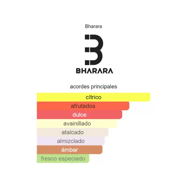 Bharara King es una fragancia cítrica‑afrutada y dulce, con salida de naranja, limón y bergamota, corazón de notas afrutadas y fondo de vainilla, almizcle blanco y ámbar. Su aroma es fresco, juvenil y envolvente, ideal para ocasiones diurnas y climas cálidos.